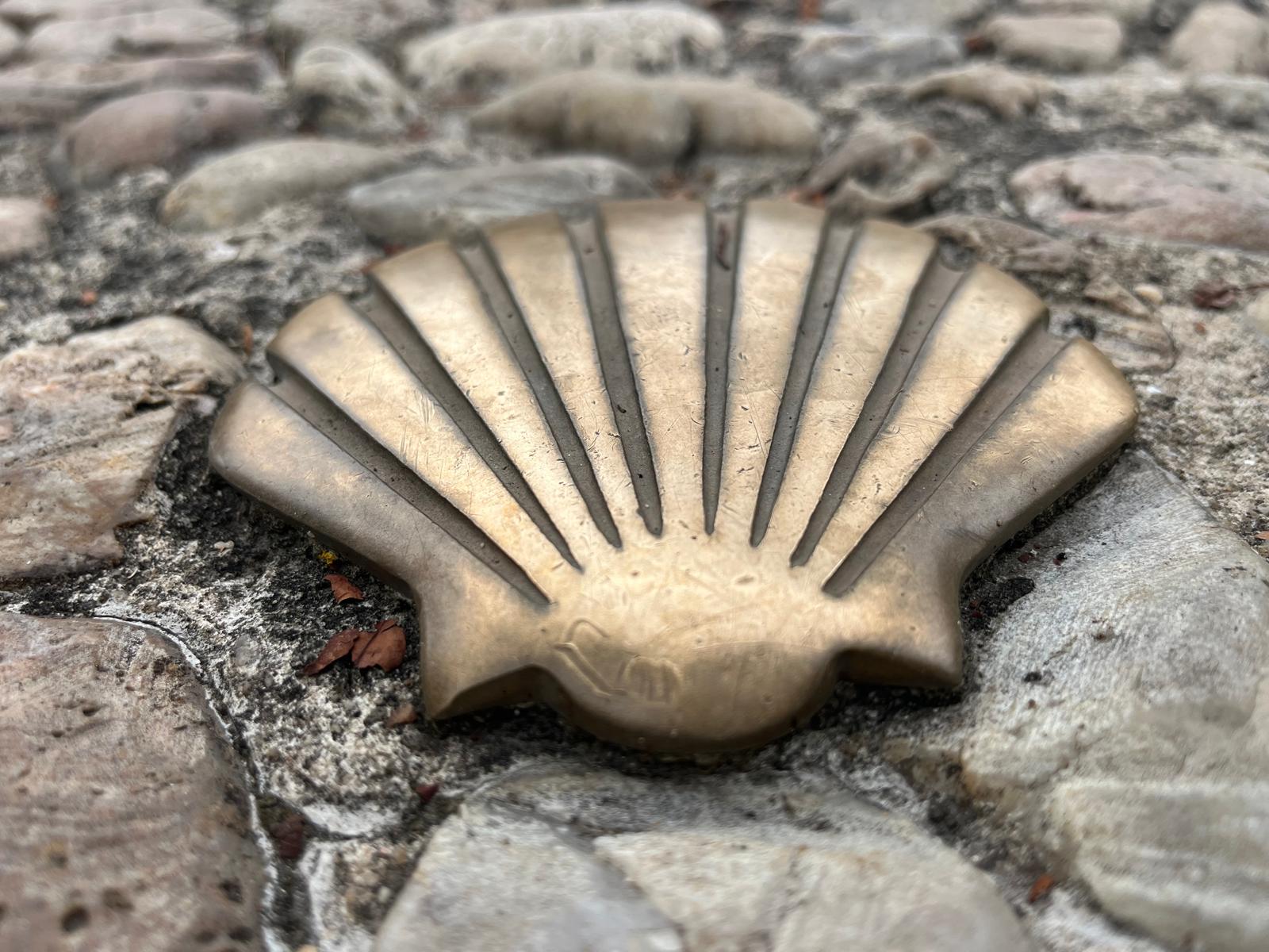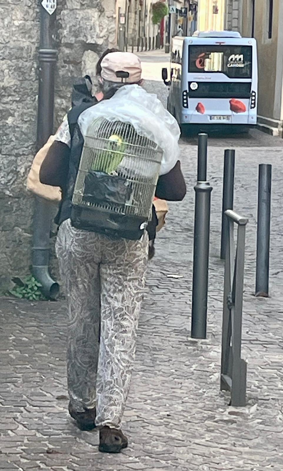 Veel pelgrims gezien, jong en oud, met hoeden en petten, met of zonder stok. Maar de gekste was iemand die een kooi met een papegaai op de rug droeg. Hoe dan?