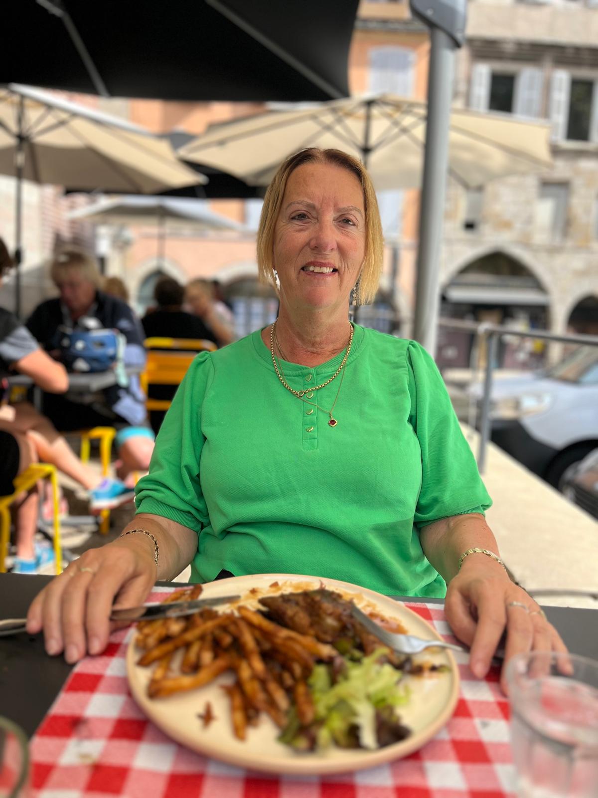 We wandelen door de oude stad. Mooi hier. Bij de Hallen is alleen het restaurantje open, morgen weer de markt. Heerlijk menu du jour, eendenbout, frites en sla. Biologisch biertje om het af te maken. Als ik wil betalen schijnt de zon in het pinautomaat. De jonge knappe ober, begint te flirten. Hij houdt een theedoek voor mij en voor hemzelf. Zo ontstaat er een cozy sfeer, Olalalla is het enige wat ik in een soort van Frans eruit krijg. Krijg een geweldige glimlach. Dat doet ie goed, de fooi volgt. Ik lees een boek Toujours L’amour, liefde, lust en bedrog in Frankrijk door de eeuwen heen. Flirten is een geliefd spel, dus ik probeer me aan te passen.