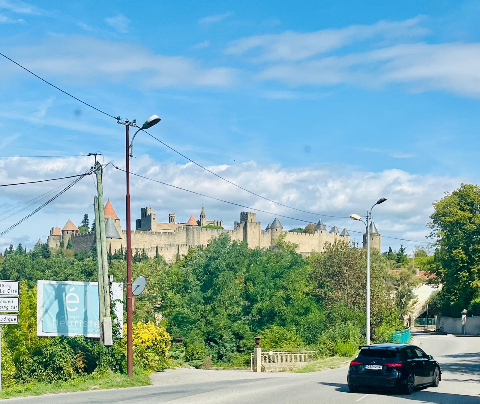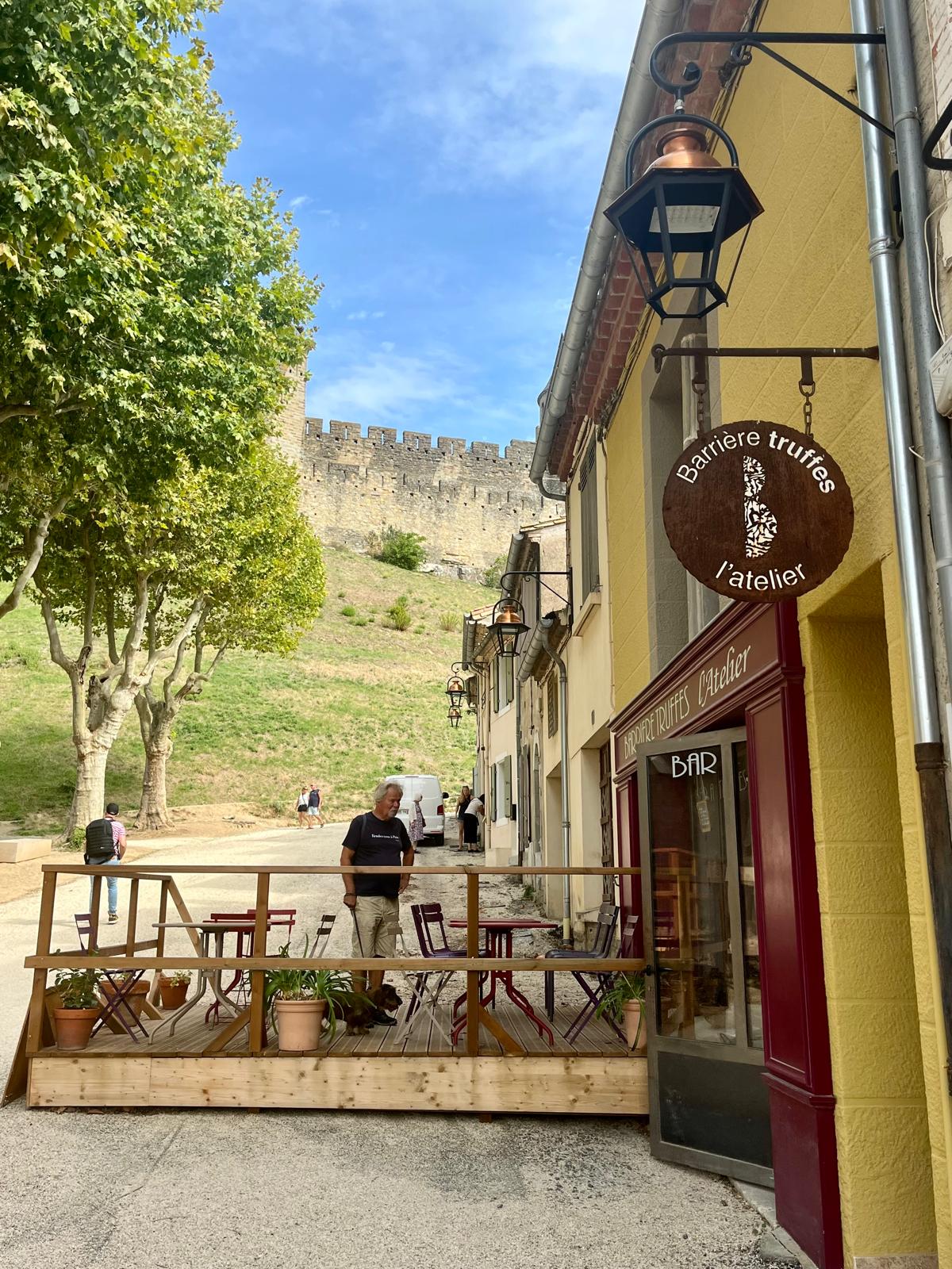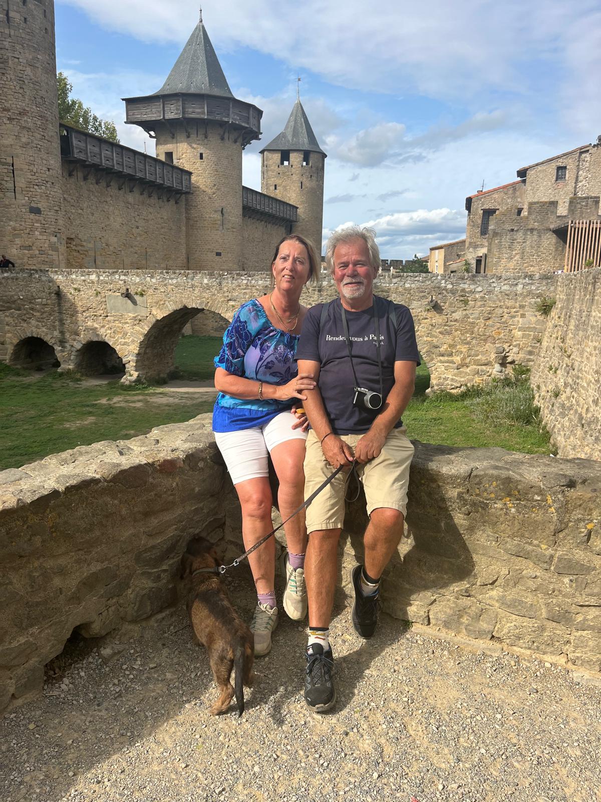 We komen steeds meer in het zonnige zuiden. We moeten ook een flinke bergkam over, maar Limoe kan het zeker aan. We staan op een CP en kunnen over een wandelpad, aan een stroompje naar de stad lopen. Zo’n 20 minuten. Mooi onder de bomen, is het heerlijk lopen. Het stadje ligt wat hoger en is helemaal ommuurd. Het is nu gezellig druk, maar in de zomer schat ik Mont Sint Michelachtige toestanden, of groepen mensen als op Koningsdag. Mooie winkels, en veel verschillende zaken, dat is toch leuker. Een Amerikaanse vrouw valt op de grond bij Pieter begint te aaien en te roepen dat zij thuis ook een teckel heeft. Netty zegt: “Dat geloof ik niet. ” Haar vriendinnen beginnen te lachen en denken nu ben je aan de beurt, inderdaad zien we foto’s van deze boerderij teckel. Totaal onverzorgd en inderdaad is er een teckel in te ontdekken. Erica, Pieters plukker, zou hier dagen mee bezig zijn 🙈. Leuk stadje om lekker doorheen te lopen. Onze vrijmibo bestaat uit gin-tonic, lekker worstje en slappe chips. Vanavond koken we zelf een camping diner, heerlijk.