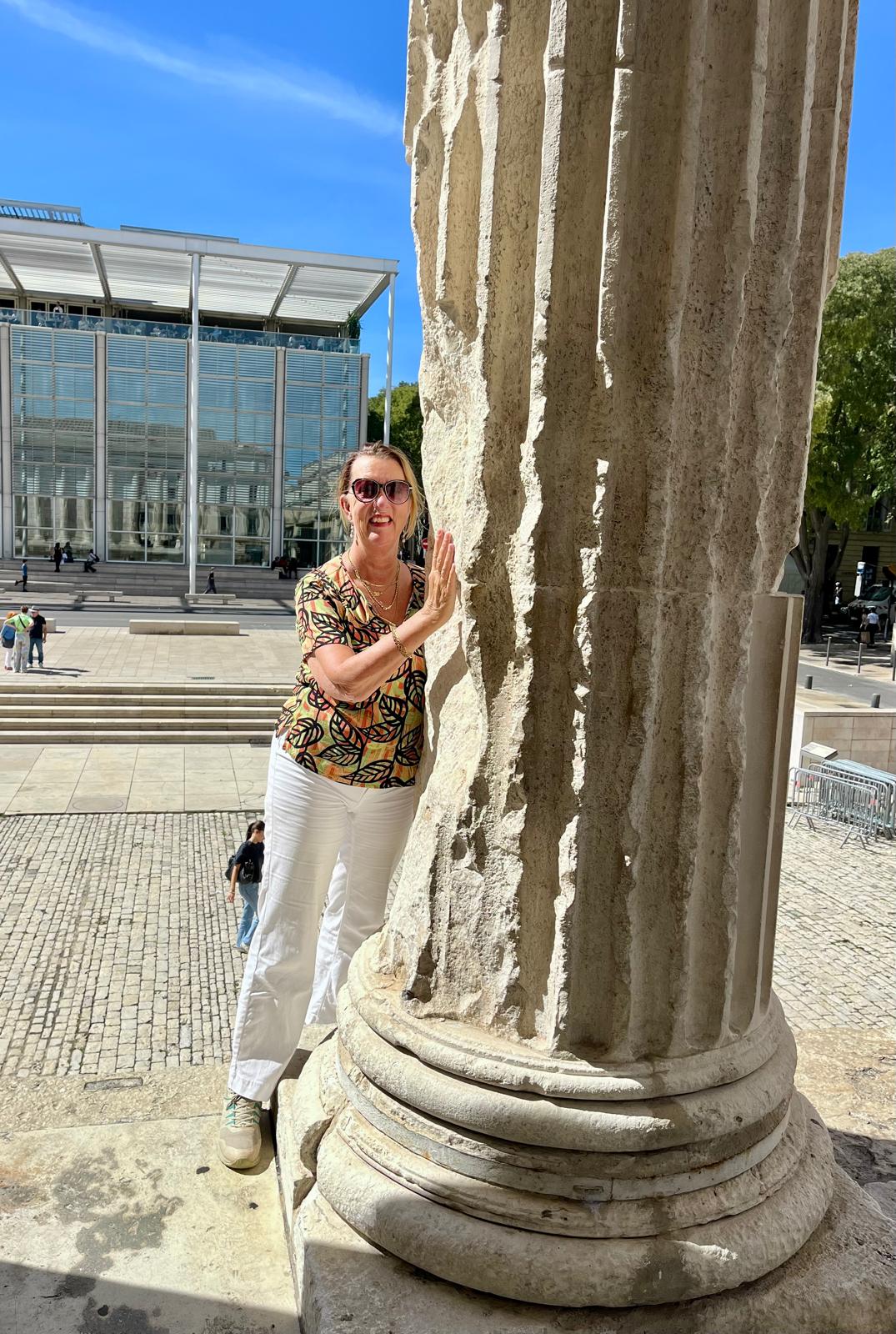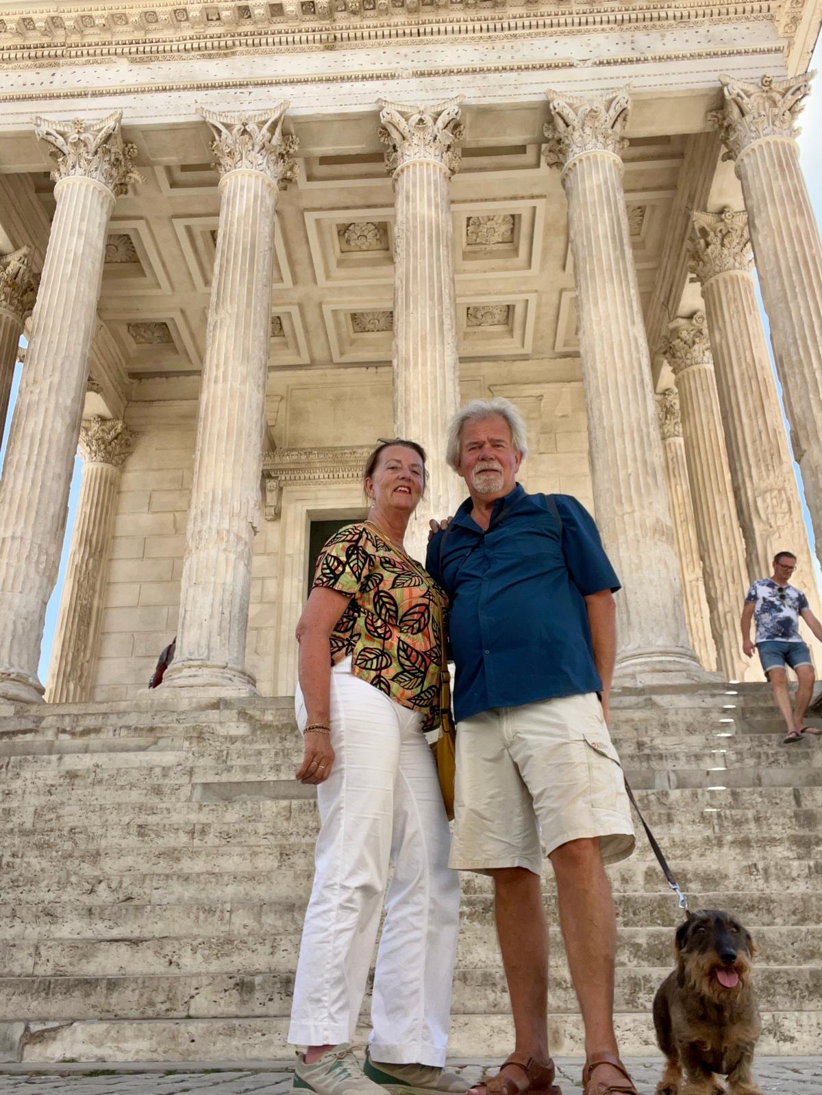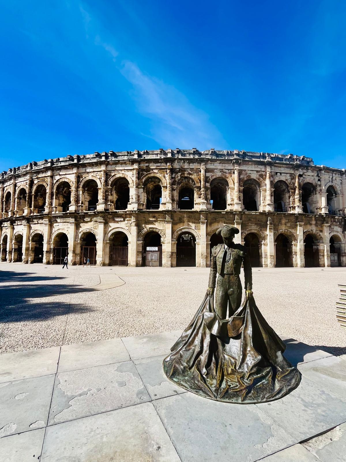 Via ons Duitse buurman, die is getrouwd met een Rwandese vrouw en in Frankrijk woont, de tip om naar Montpellier te gaan. Hij had wel wat leuke plekjes ook de route bleu,mooi langs de mediteranée. Interessante man die als psycholoog via Stanford organisatie adviseur werd voor de Duitse overheid. Toen hij ook gevraagd werd om zich in te zetten voor een olie bedrijf en Pharma besloot hij het over een andere boeg te gooien. Deze richtingen waren voor hem een no go. Veel gewerkt in Afrika, de Frans sprekende landen Mali, Niger, Senegal, Rwanda en daar ontwikkelingswerk gecoördineerd. Daar ook zijn vrouw gevonden en alle drie hun kinderen zijn daar geboren. Toen de jongste 4 weken was, moesten ze het land uit, de burgeroorlog was te gevaarlijk. Mooie verhalen maar ook inzichten die je vooraf niet had, Wat weten we eigenlijk over Afrika. Misschien wel te weinig. Hij was nu met pensioen en woont in Zuid-Frankrijk. Helaas geen Montpellier, de culturele zaken die we wilden zien waren gesloten, en geen goede PR voor onze auto. Door naar Nîmes. Zeer grote milieuzone, maar ook goed geregeld. Aan de rand grote parkeerplekken en goede verbindingen met de stad. Met het OV de stad in, heerlijk weer. De Romeinen hebben Nîmes veroverd en Caesar vestigde hier veel veteranen, een groot deel kwam uit Egypte. de herkomst van deze nieuwkomers verklaart de krokodil die in die tijd op de munten werd afgebeld. Overal in de stad zie je dit terug in het wapen van de stad zie je nog steeds een krokodil. Augustus benoemde dit 27 jaar voor Chr. tot een kolonie van Rome. De opdracht was om een muur om de stad te bouwen en veel openbare gebouwen zijn nog steeds terug te vinden in de stad. Wij gaan naar de arena, in die tijd konden er 24.000 bezoekers in. Nu vooral gebruikt voor stierengevechten en concerten. Zoals Rammstein en Metallica. De linksdragende stierenvechter staat in actie voor de arena.