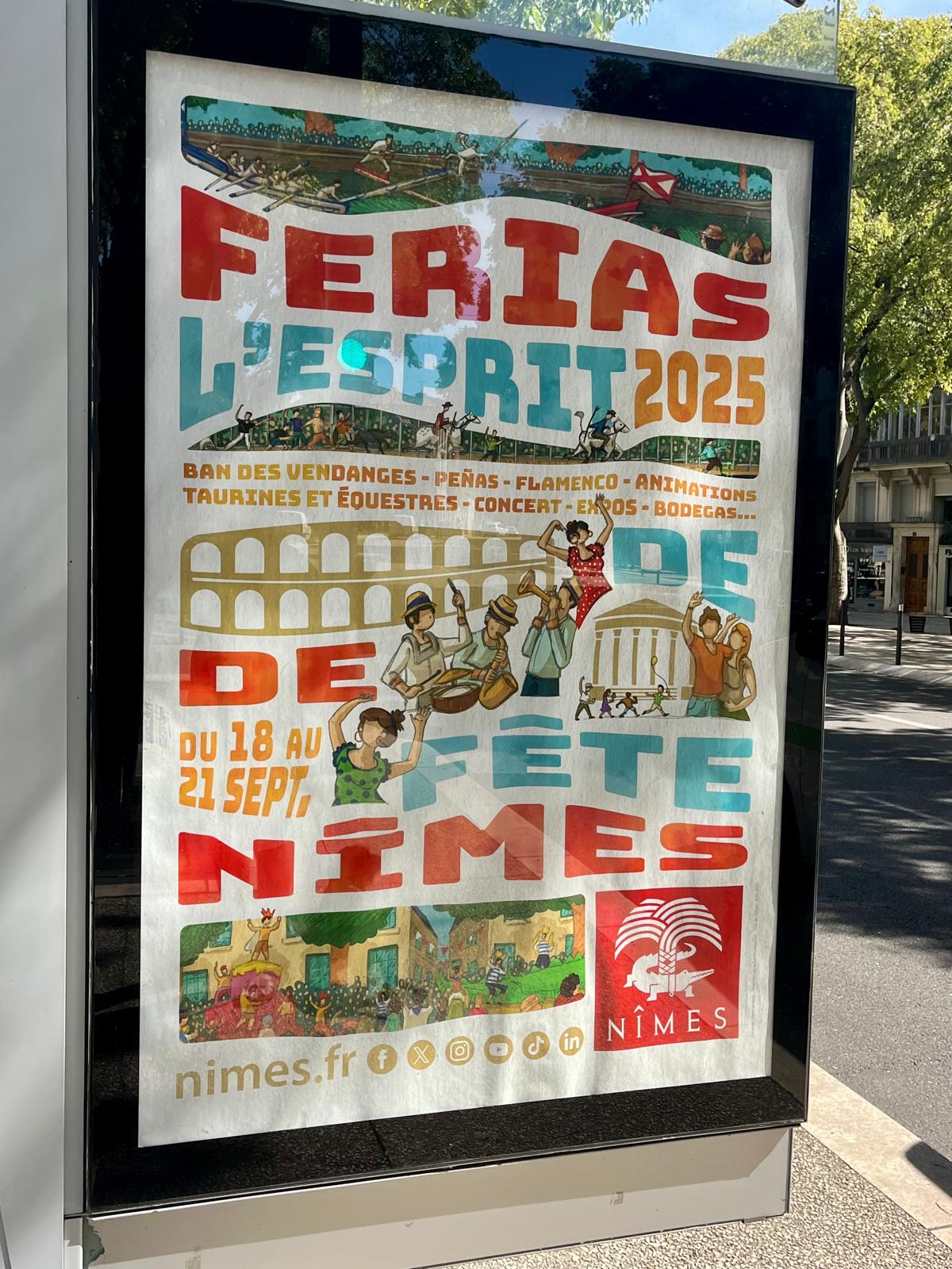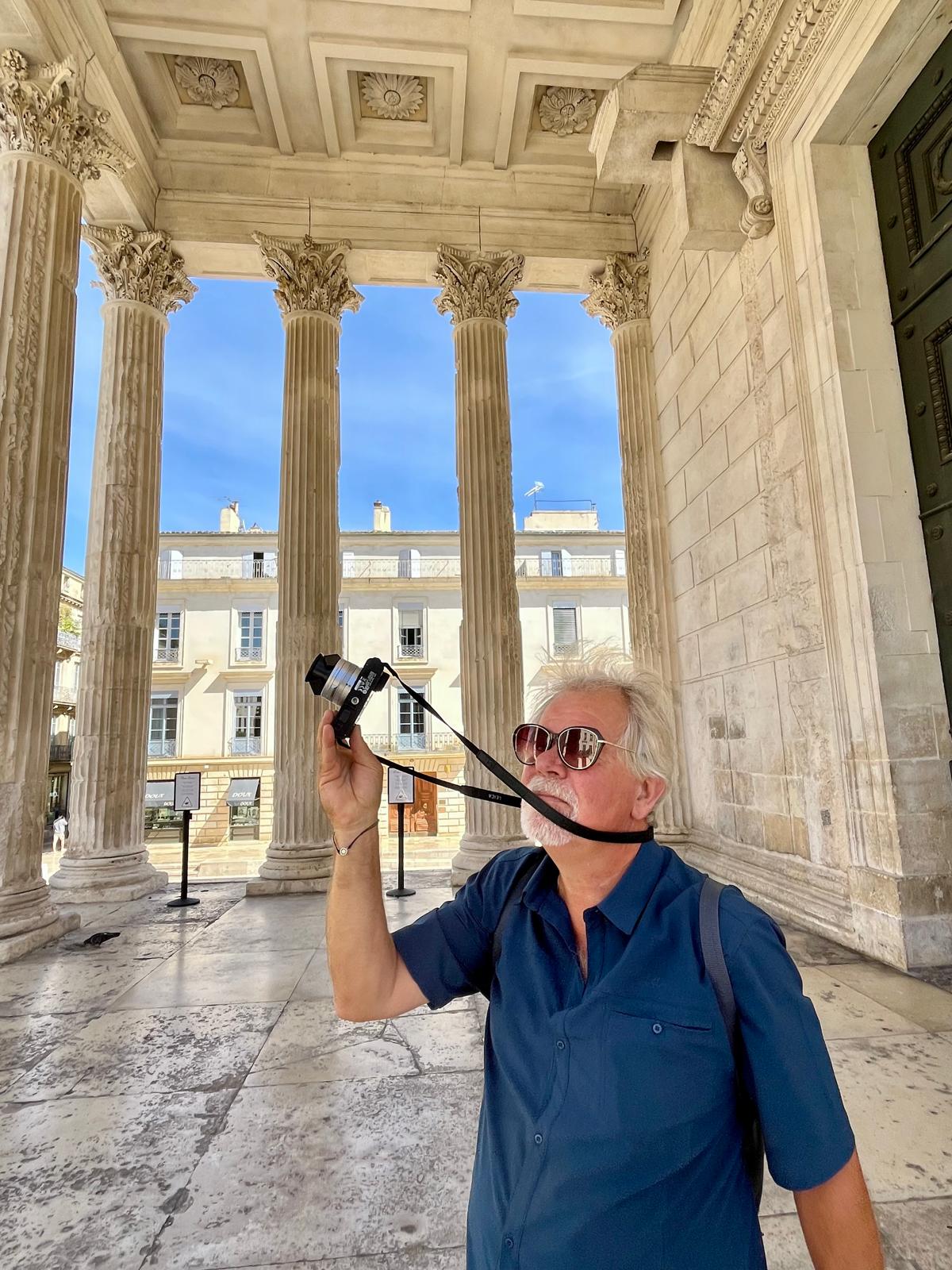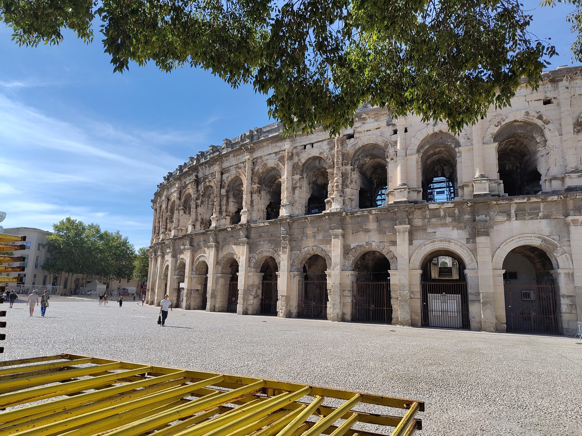 Via ons Duitse buurman, die is getrouwd met een Rwandese vrouw en in Frankrijk woont, de tip om naar Montpellier te gaan. Hij had wel wat leuke plekjes ook de route bleu,mooi langs de mediteranée. Interessante man die als psycholoog via Stanford organisatie adviseur werd voor de Duitse overheid. Toen hij ook gevraagd werd om zich in te zetten voor een olie bedrijf en Pharma besloot hij het over een andere boeg te gooien. Deze richtingen waren voor hem een no go. Veel gewerkt in Afrika, de Frans sprekende landen Mali, Niger, Senegal, Rwanda en daar ontwikkelingswerk gecoördineerd. Daar ook zijn vrouw gevonden en alle drie hun kinderen zijn daar geboren. Toen de jongste 4 weken was, moesten ze het land uit, de burgeroorlog was te gevaarlijk. Mooie verhalen maar ook inzichten die je vooraf niet had, Wat weten we eigenlijk over Afrika. Misschien wel te weinig. Hij was nu met pensioen en woont in Zuid-Frankrijk. Helaas geen Montpellier, de culturele zaken die we wilden zien waren gesloten, en geen goede PR voor onze auto. Door naar Nîmes. Zeer grote milieuzone, maar ook goed geregeld. Aan de rand grote parkeerplekken en goede verbindingen met de stad. Met het OV de stad in, heerlijk weer. De Romeinen hebben Nîmes veroverd en Caesar vestigde hier veel veteranen, een groot deel kwam uit Egypte. de herkomst van deze nieuwkomers verklaart de krokodil die in die tijd op de munten werd afgebeld. Overal in de stad zie je dit terug in het wapen van de stad zie je nog steeds een krokodil. Augustus benoemde dit 27 jaar voor Chr. tot een kolonie van Rome. De opdracht was om een muur om de stad te bouwen en veel openbare gebouwen zijn nog steeds terug te vinden in de stad. Wij gaan naar de arena, in die tijd konden er 24.000 bezoekers in. Nu vooral gebruikt voor stierengevechten en concerten. Zoals Rammstein en Metallica. De linksdragende stierenvechter staat in actie voor de arena.