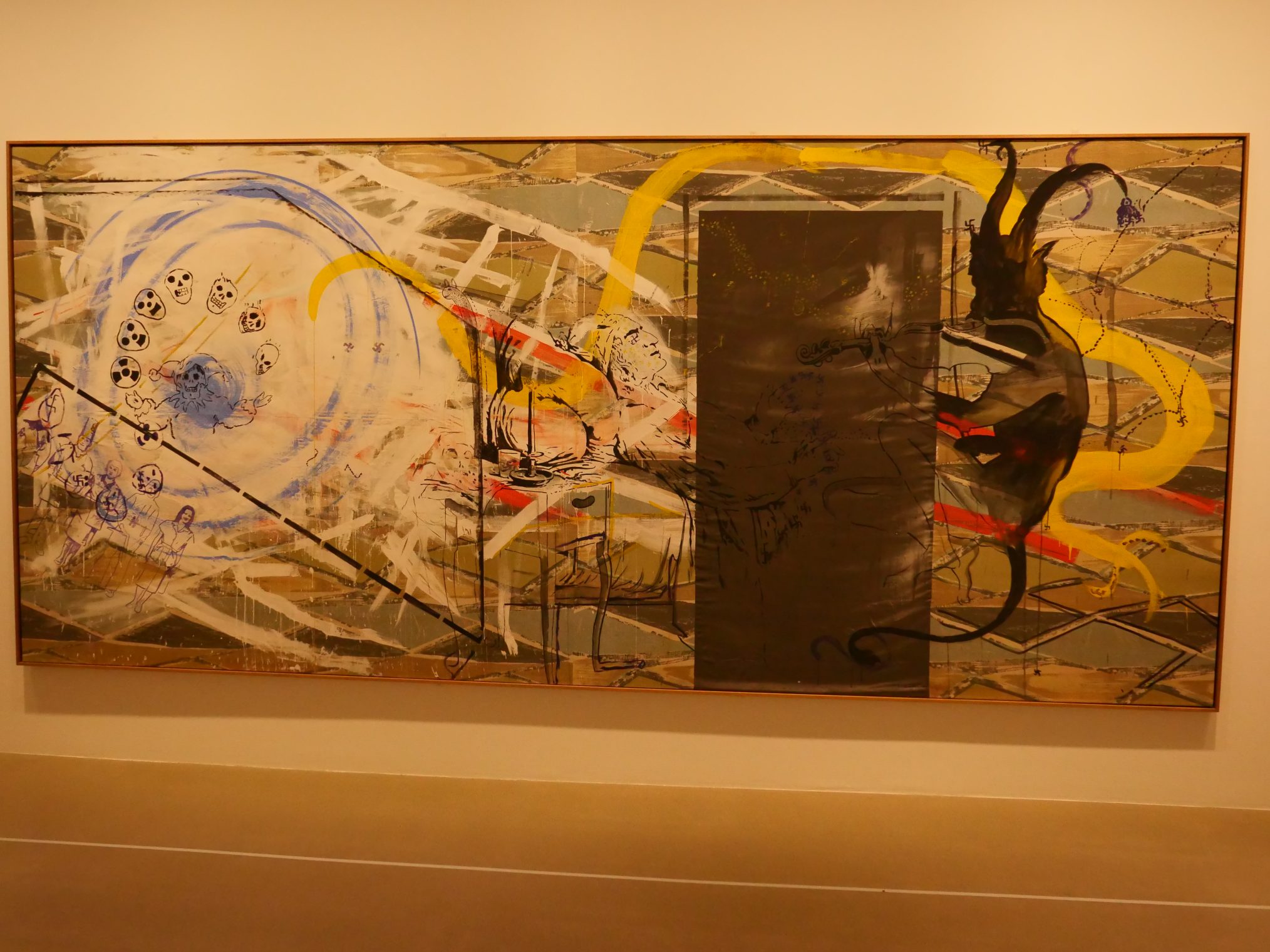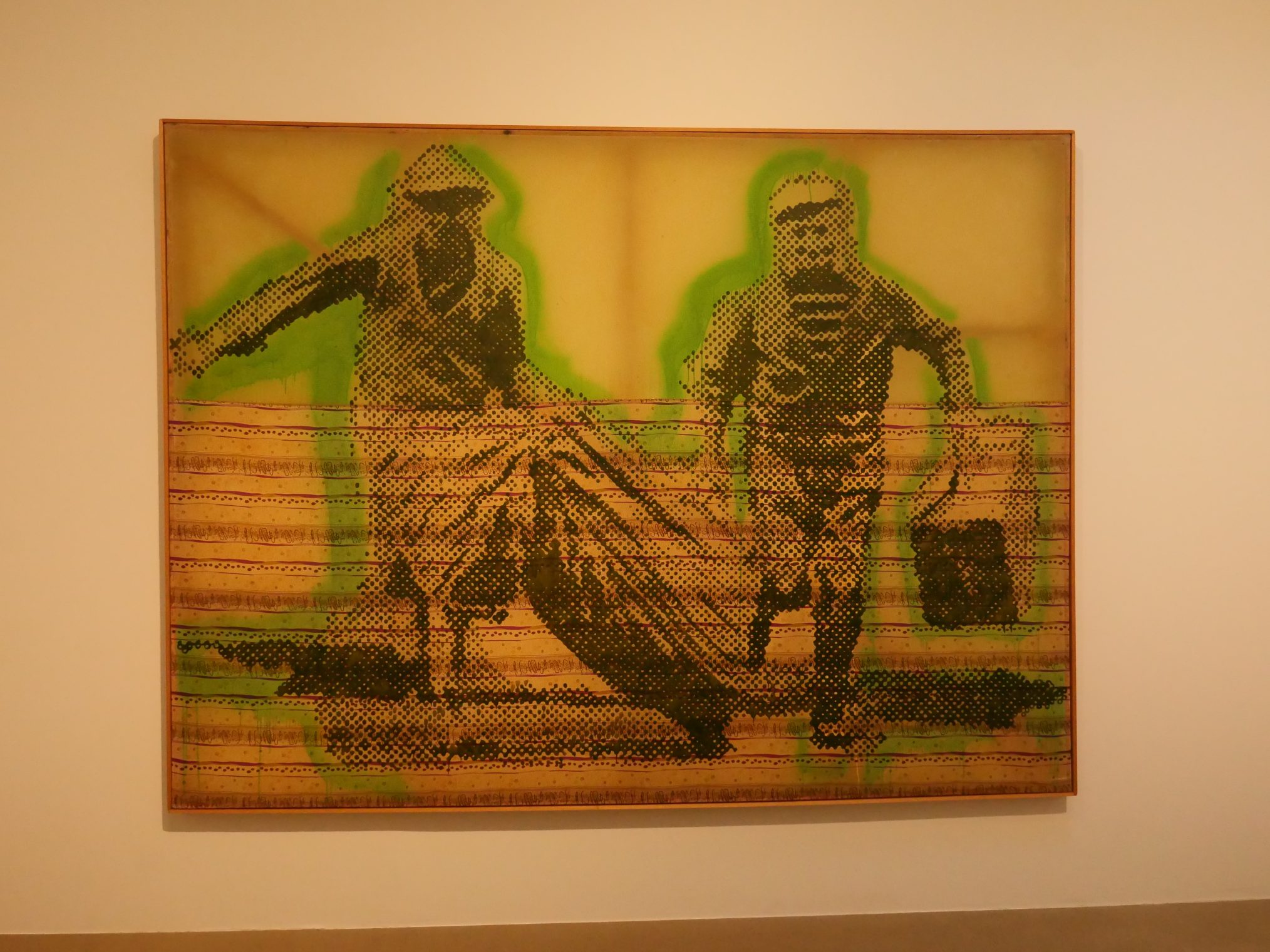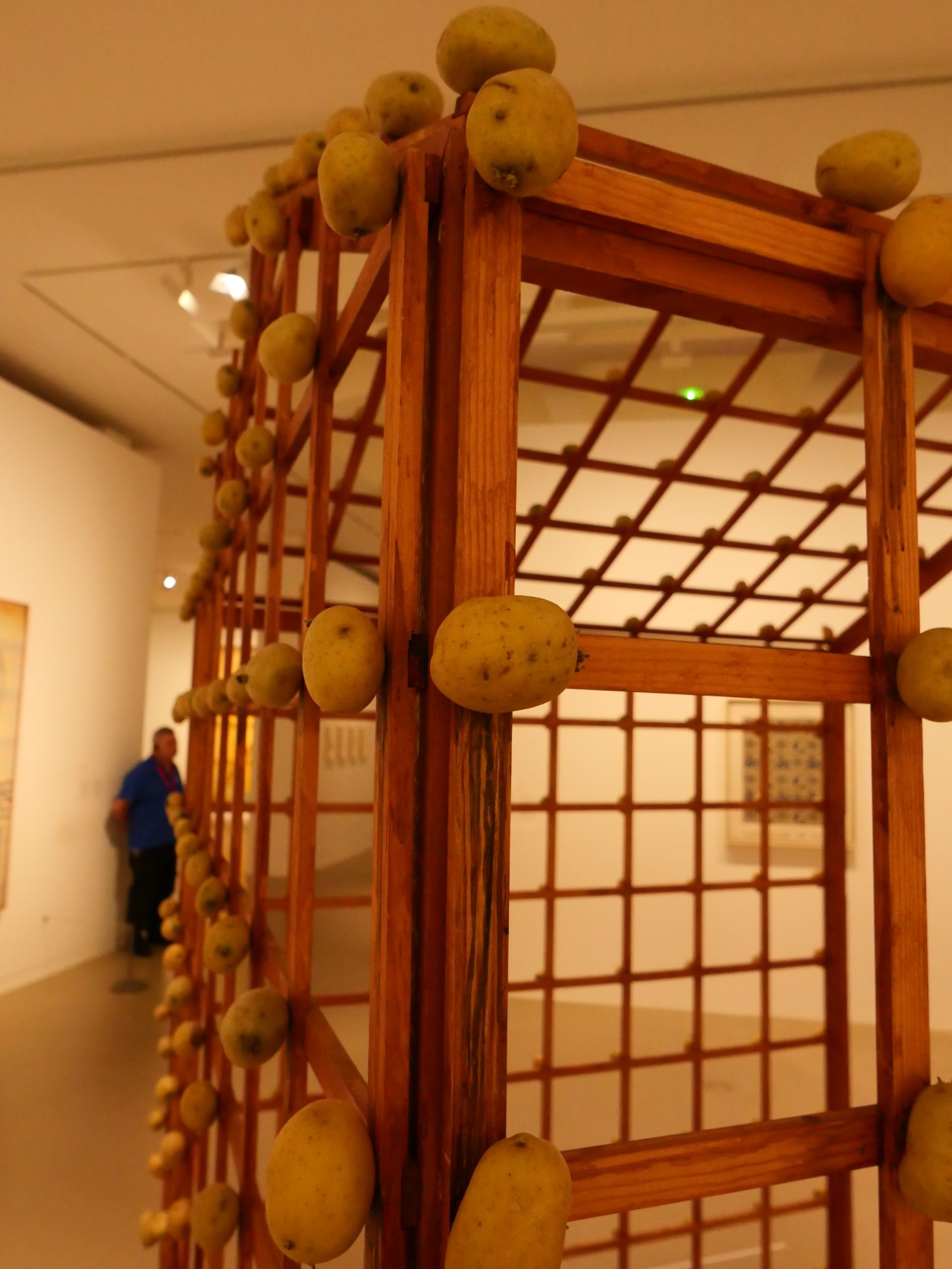 De Vincent Foundation vertoont hier werk van mensen die geïnspireerd zijn door van Gogh. Anne gaat naar binnen ik wacht buiten met Pieter. De tentoonstelling toont werk van de Duitse kunstenaar Sigmar Polke. Hij maakt veel grafisch werk, o.a. met rastertechnieken van foto’s. Als jongen van 12 is hij met zijn ouders van Oost naar West Duitsland gevlucht. E’en van zijn schilderijen herinnert daar nog aan. Om de link naar van Gogh te maken is er een installatie met aardappels 😉