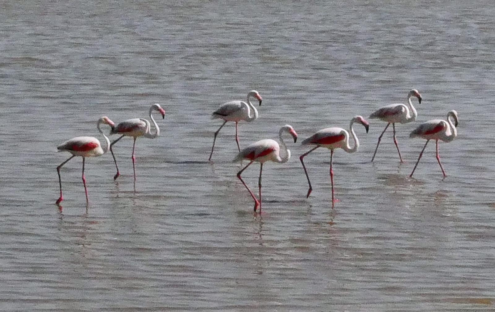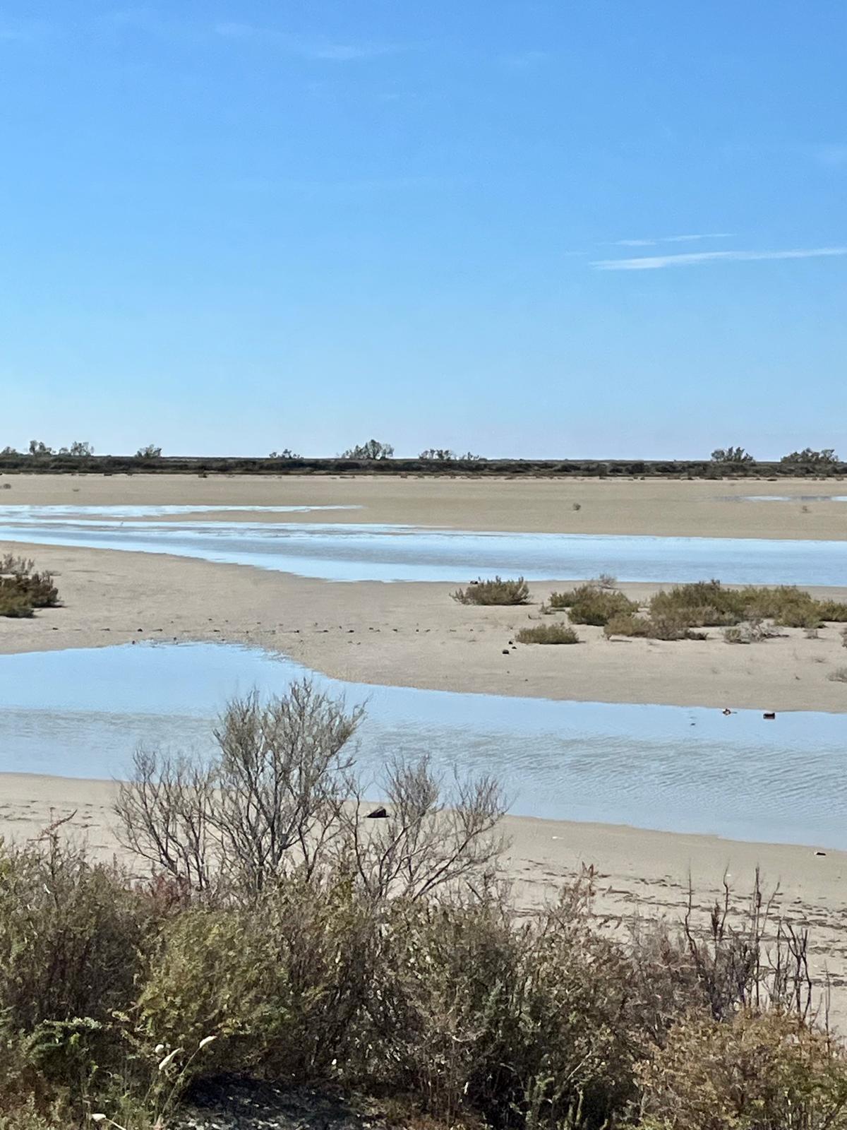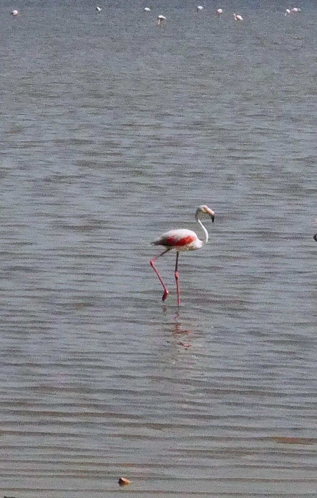 Je kunt niet dichtbij komen, overal water en slenken en drassig land. Een mooi gezicht als de paarden staan te drinken. Afwisseling van vlakke stukken land, soms drassig als gebied voor de vogels, maar ook boerenland waar nog gewoon geboerd wordt. Vaak aan beide kanten van de weg riet of bamboe. Voor de vele fietsers wel wat saai om daar te rijden. Het is hier niet druk, na de wegen met begroeiing, nu in open landschap, waar wij erg van houden. Overal roze flamingo’s en veel zoutaanslag op de weg en de grond, brak water.