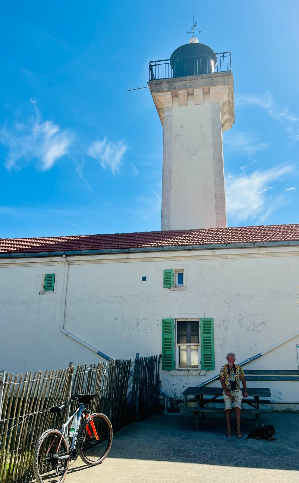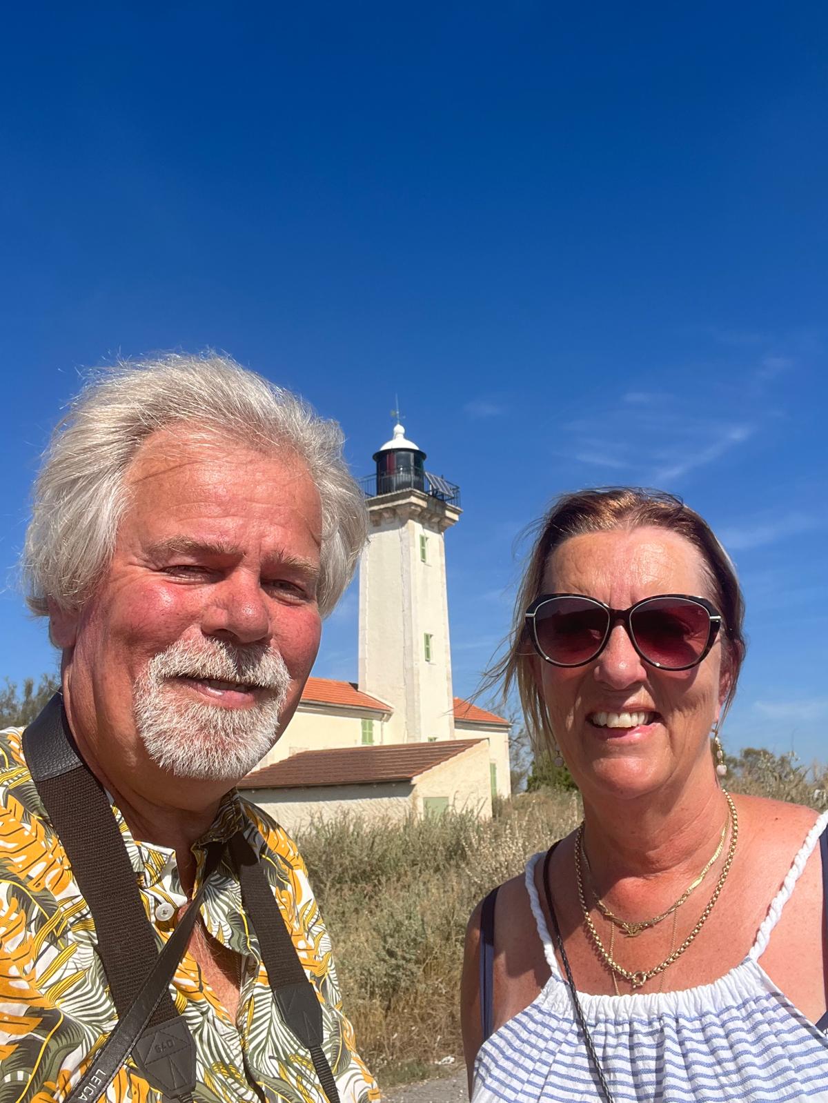 We parkeren de auto en lopen ruim 2 kilometer naar een vuurtoren. Op de fiets zou je er wel kunnen komen met de auto niet. Phare de la Gacholle, met een woonhuis en wat bankjes en water. Er wordt gewaarschuwd voor hoog water, geen idee of in de winter deze toren met zijn voetjes in het water staat. Mooie wandeling, en goed heet, we drinken een cola met citroen.