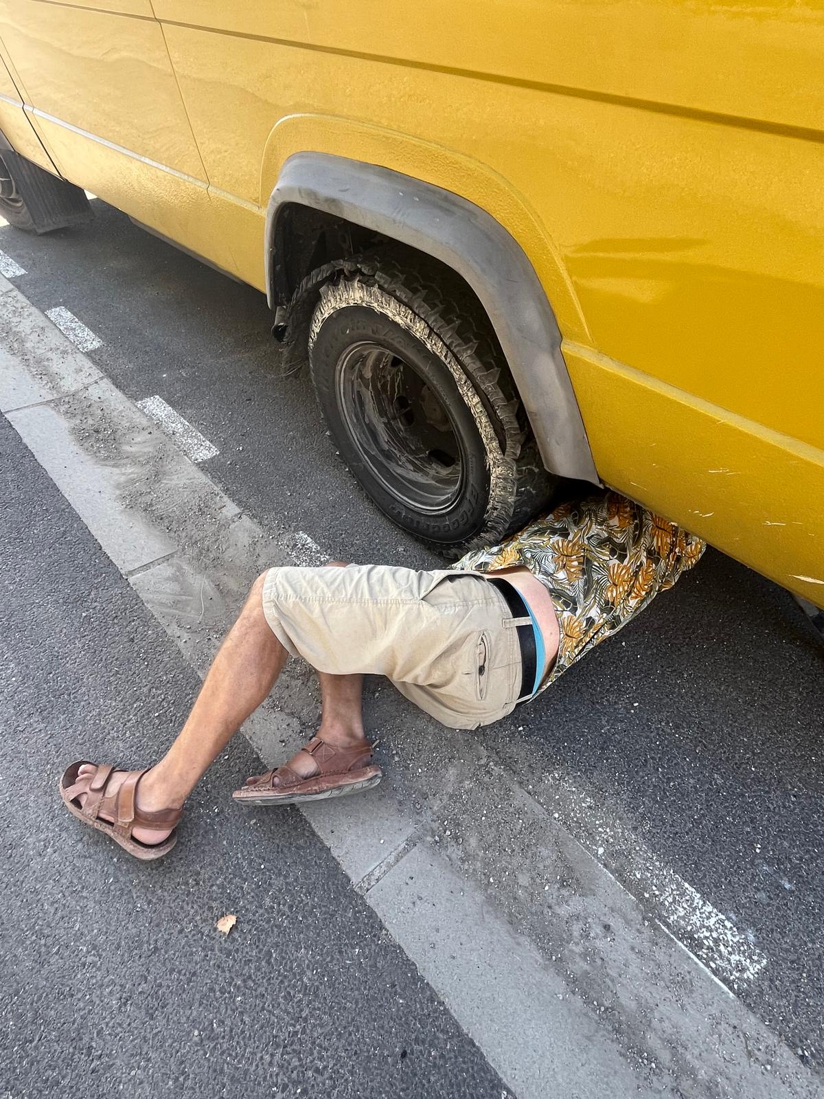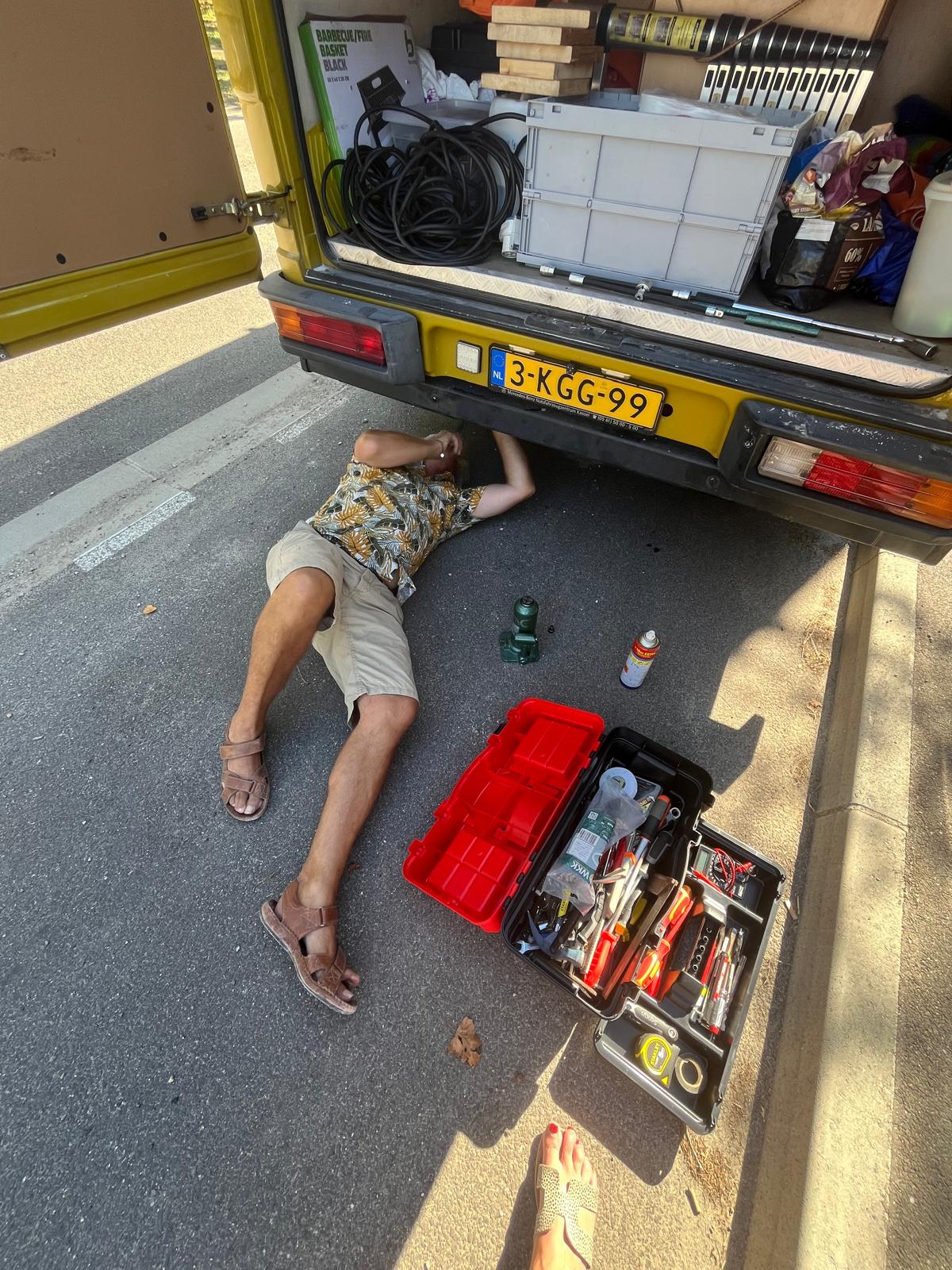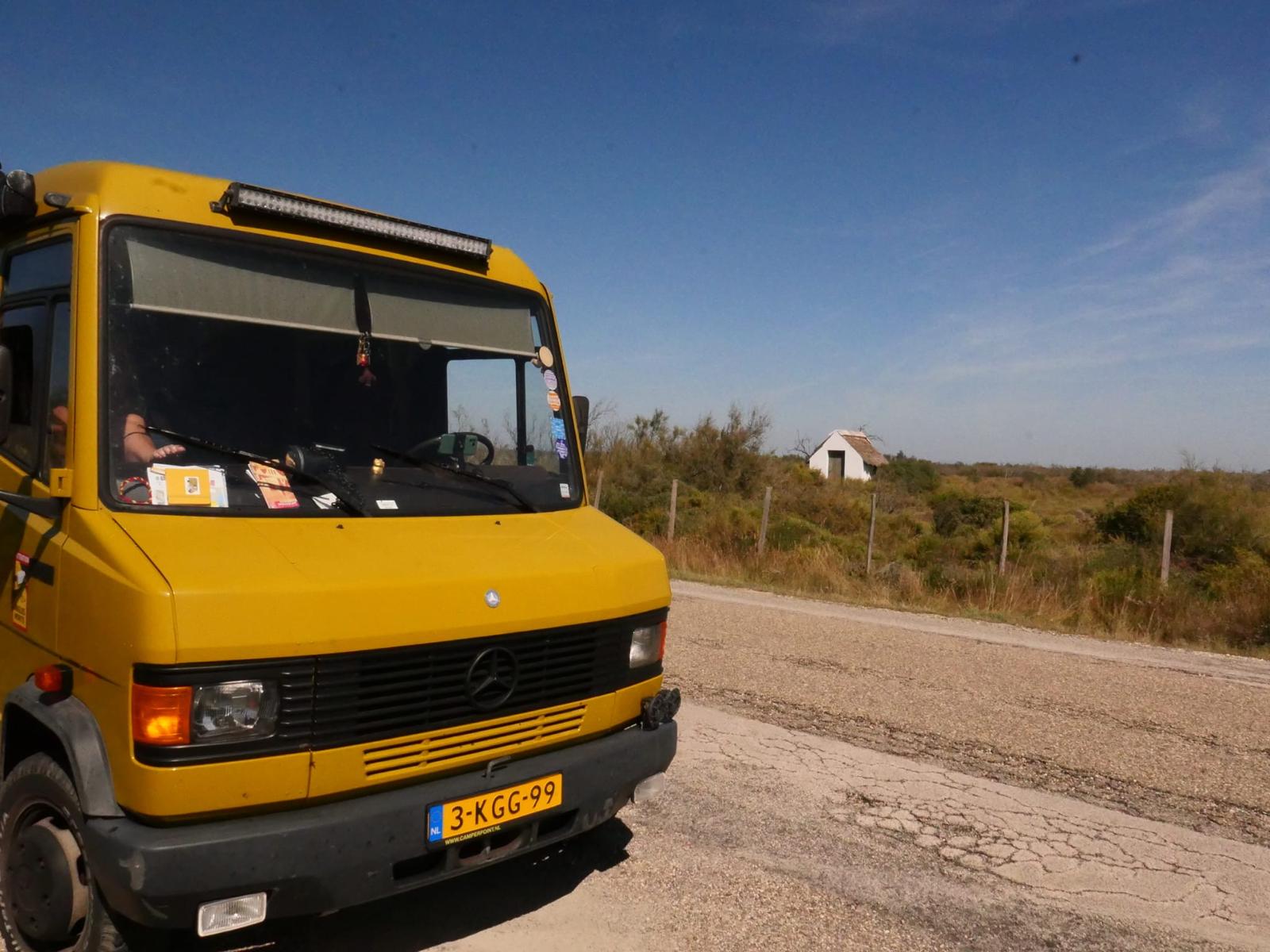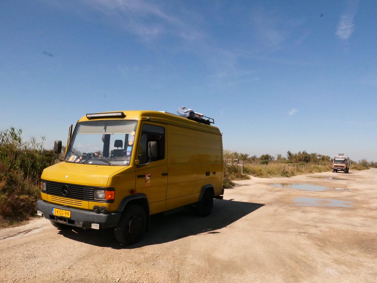 We rijden voor de laatste etappe naar de zoutpannen, als we er bijna zijn horen we een raar geluid….stuk rubber van de linkerbuitenachterband is aan gort. Hier kunnen we niet verder mee. Staan half op een stoep. Maar Anne gaat aan de slag. Heel veel werk om de reserveband onder de auto vrij te maken. De kapotte band is onderdeel van de dubbellucht maar het lukt uiteindelijk allemaal. Reserveband plaatsen en kapotte band weer onder de auto met een sjorband vast. Een hele klus waar Anne het werk moet doen. Ik kan alleen wat drinken geven, complimenten en sleutels aangeven. Gelukkig is Anne handig en ook sterk. Blij dat ik hier niet alleen sta, dan moest ik de Franse ANWB bellen.