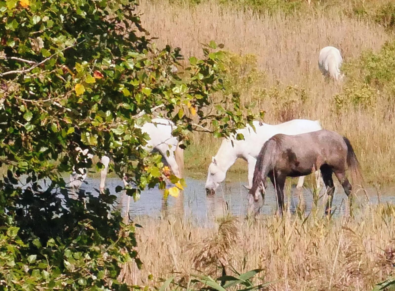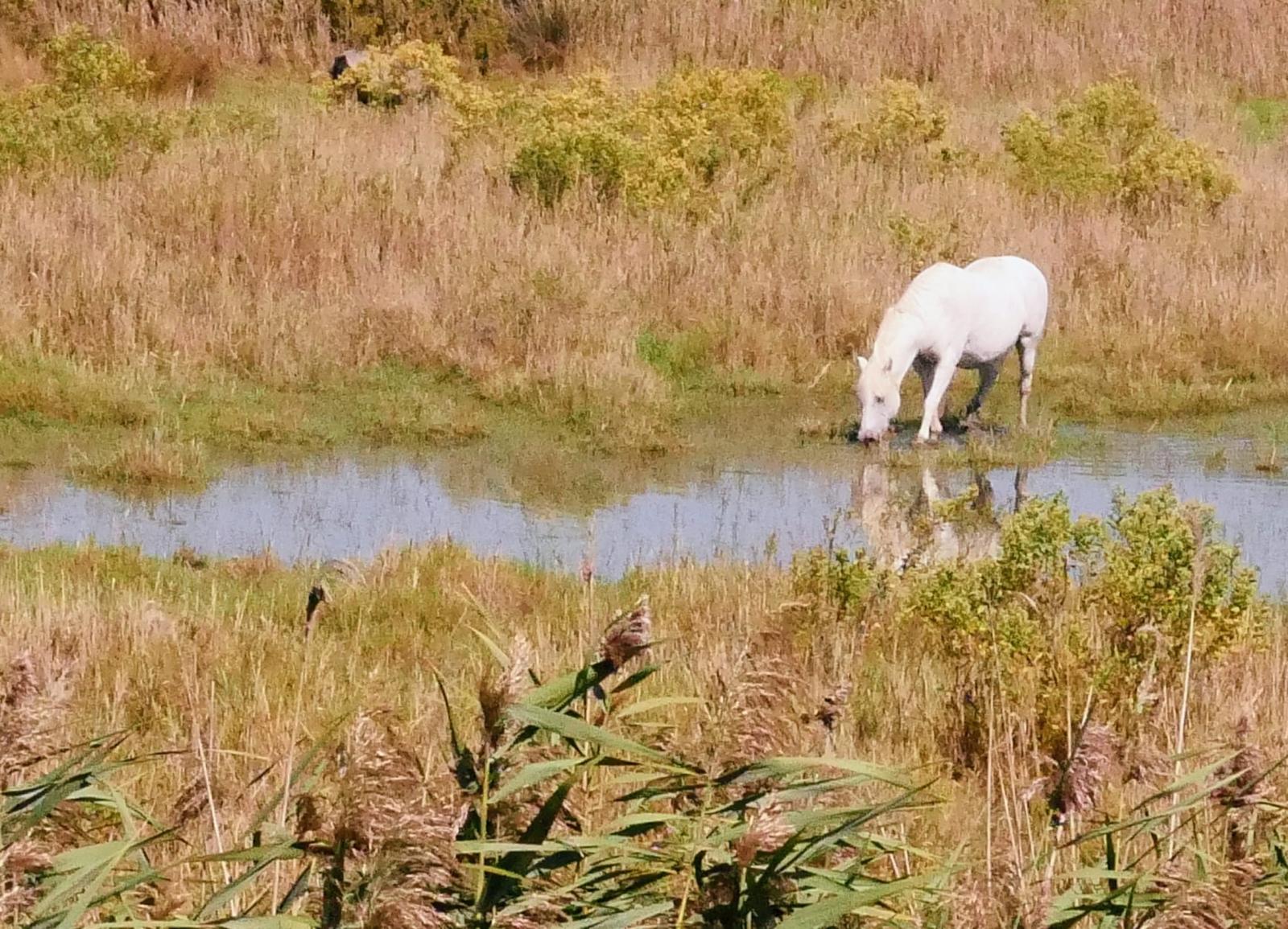 Het wordt een mooie een warme dag boven de 30 graden. We boeken nog een nachtje bij en gaan op zoek naar de wilde paarden, flamingo’s en zoutpannen. Eerst naar musée de la Carmarque voor wat informatie. We zien vrij snel al een groepje wilde paarden, wit en bruin.