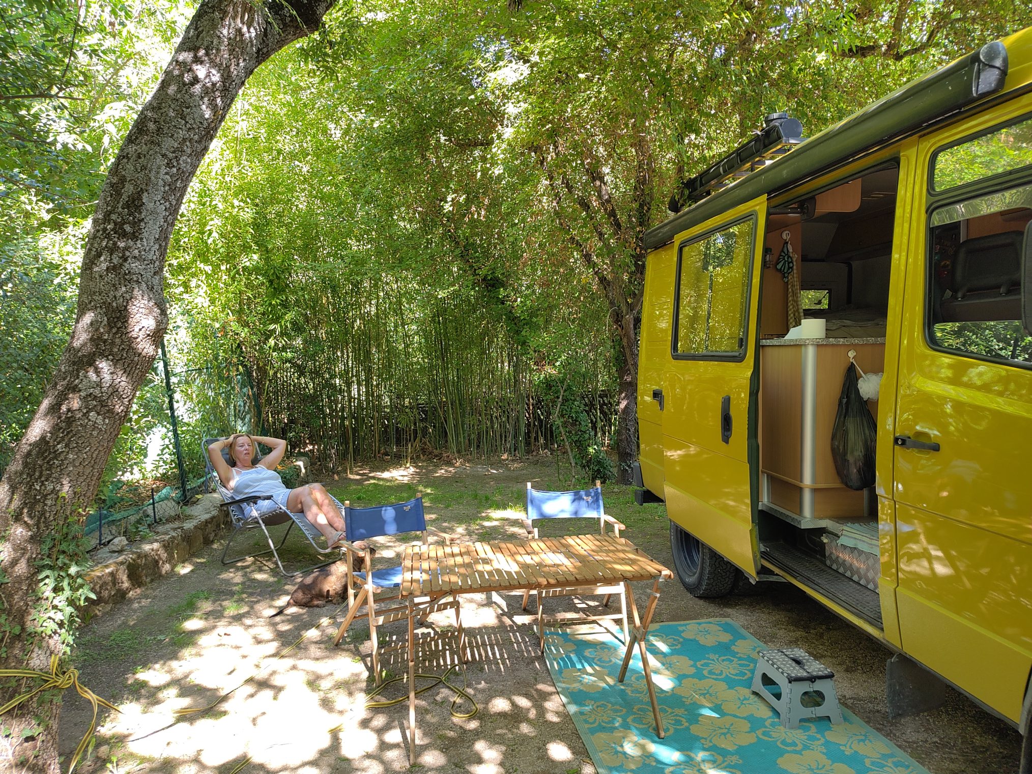 Zonder oponthoud komen we aan op de camping Arc-en- Ciel, camping regenboog. Prachtige camping al sinds 1950, mooi aangelegd, met een riviertje wat over de camping loopt. Hierdoor ook wat bruggetjes en veel planten. Heel veel groen, hierdoor voelt het alsof je in een woud staat ipv een stad. Ouderwets sanitaire maar brandschoon en een zwembad. Overal bordjes en regels. De dames, moeder en dochter 4 e generatie, hebben de wind er goed onder. Moeder sjeest op een golfkar en wijst je de plek en hoe je moet staan, zodat je ook weer makkelijk kan wegkomen. Eerst voor 1 nacht, want het is hier ook nog goed vol. De moeder spreekt ook Nederlands. Pittig wijfie, maar dat moet ook wel met al die boomers die het allemaal zelf zo goed weten.