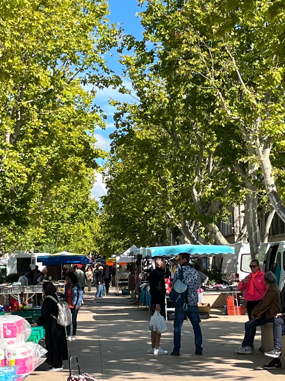 We koken een lekker maaltje en gaan op tijd naar binnen. ‘s Avonds is het te koud om buiten te zitten, sterker nog we doen op een bepaald moment de standkachel aan. Opeens hard gebonk op de deur, paniekerig zelfs, wat is er aan de hand? We doen de schuifdeur open, Pieter begint te blaffen, en Anne gaat naar buiten, zodat de deur weer dicht kan. Boze buurman, die in het Engels luid zijn gram komt halen. Het is na 22.00 uur en dan moet er rust zijn op de camping. De kachel maakt geluid en dat is verboden. Of wij de regels niet hebben meegekregen die op deze camping gelden. Nou nee, en we maken niet écht lawaai. Anne was eigenlijk flabbergasterd en liet het erbij, ondertussen had ik de kachel al op uit gedrukt. Voor het slapen nog even een rondje met Pieter, dit keer maar door de voordeur zodat de schuifdeur geen lawaai maakt. Je staat toch wel even te kijken. Maar we slapen er niet minder om. De volgende ochtend komt de buurman excuses aanbieden. Hij had de vorige dag 30 km gelopen en was bek af geweest. Daarnaast kampeerde hij in een tent, wat toch wel het ultieme kamperen was. Dit soort campinkjes waren niet ingesteld op campers met airco(?) en kachels. Waarvan akte. Ook meende hij te weten dat we hier vast vaker klachten over hebben gehad, nou nee nooit. Vreselijke betweter, die wil dat de wereld na 1970 niet meer is veranderd. We gaan naar de markt in Pertuis. Grote Provençaalse markt met alles wat je maar nodig hebt. Lastig parkeren , maar we hadden geluk. Wat lekkere olijven, peperworstje en wat eten gekocht.en uiteraard eerst alles proeven. Was leuk om hier over heen te scharrelen.