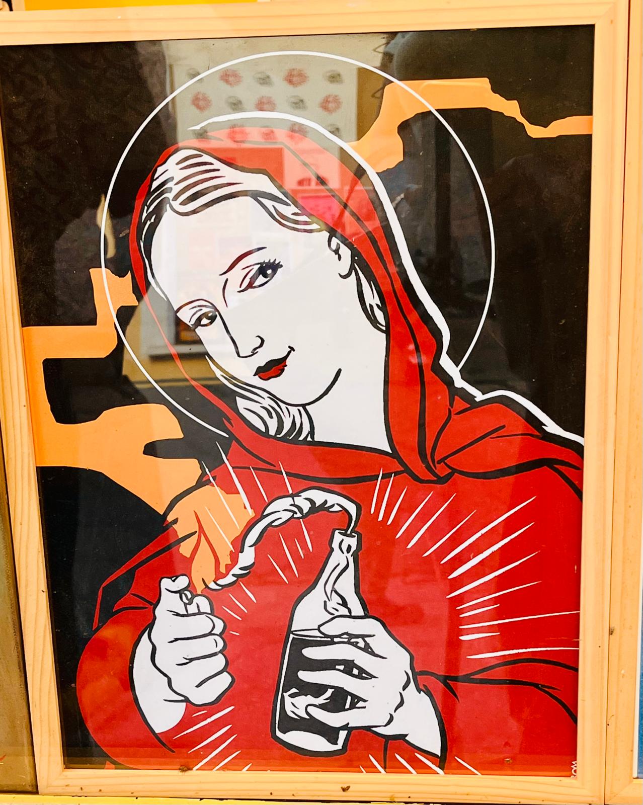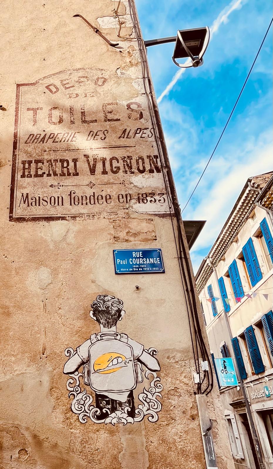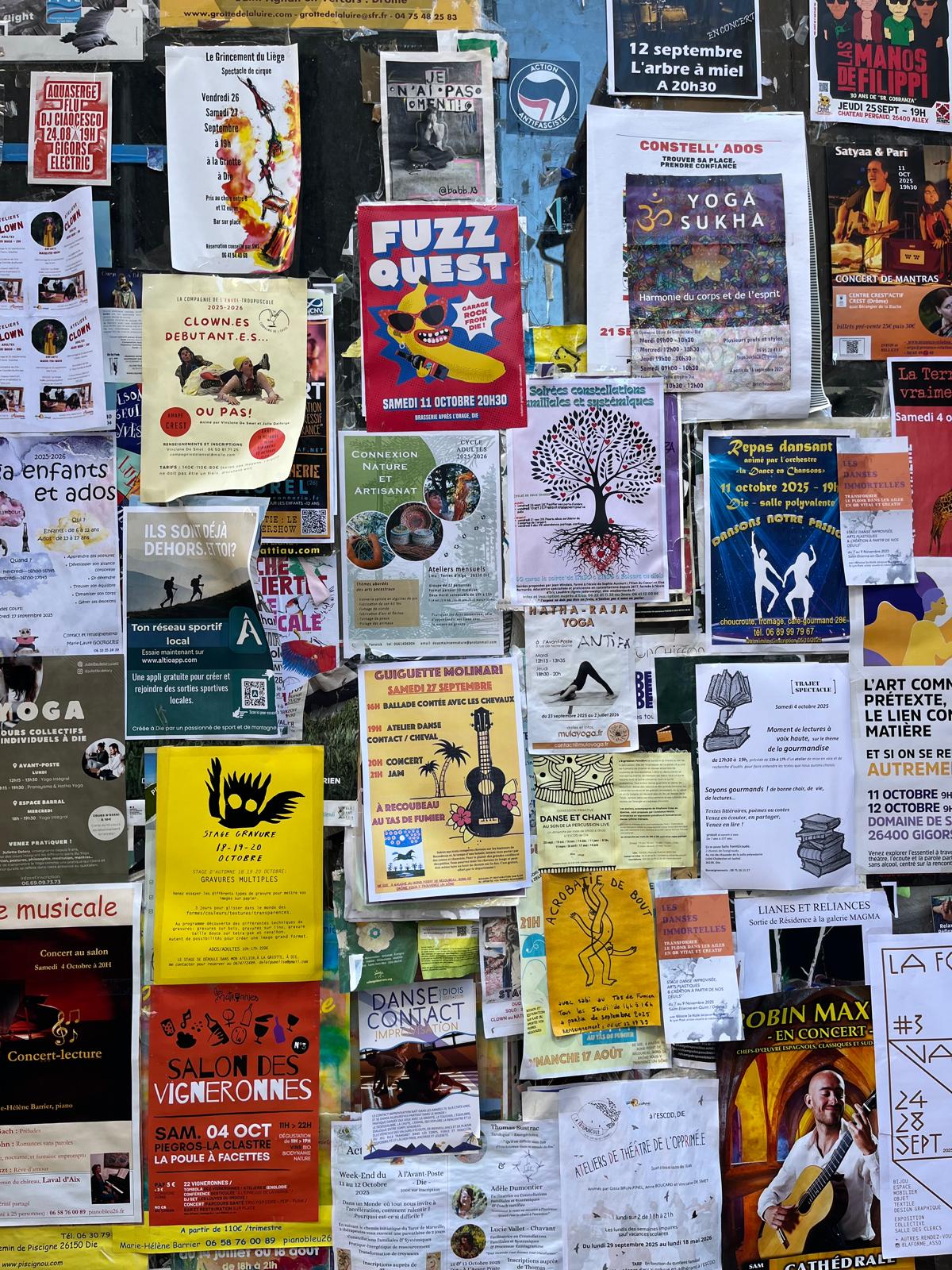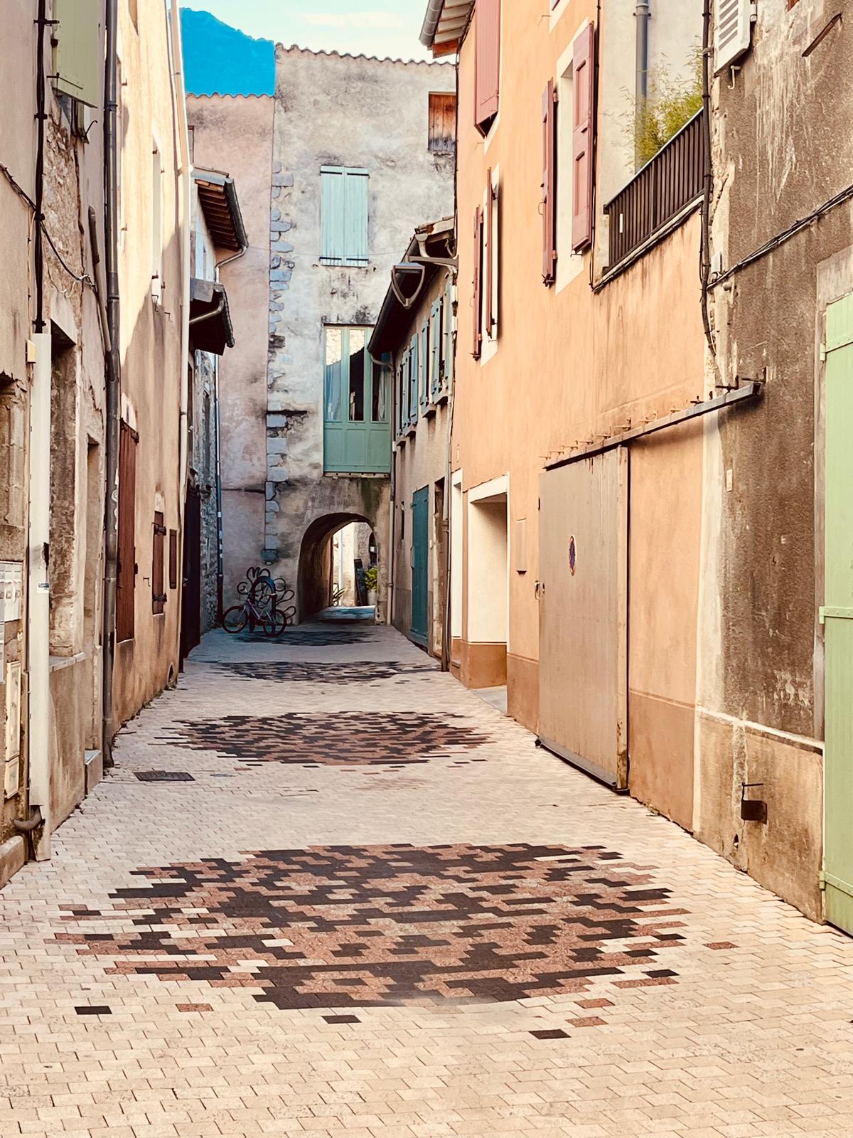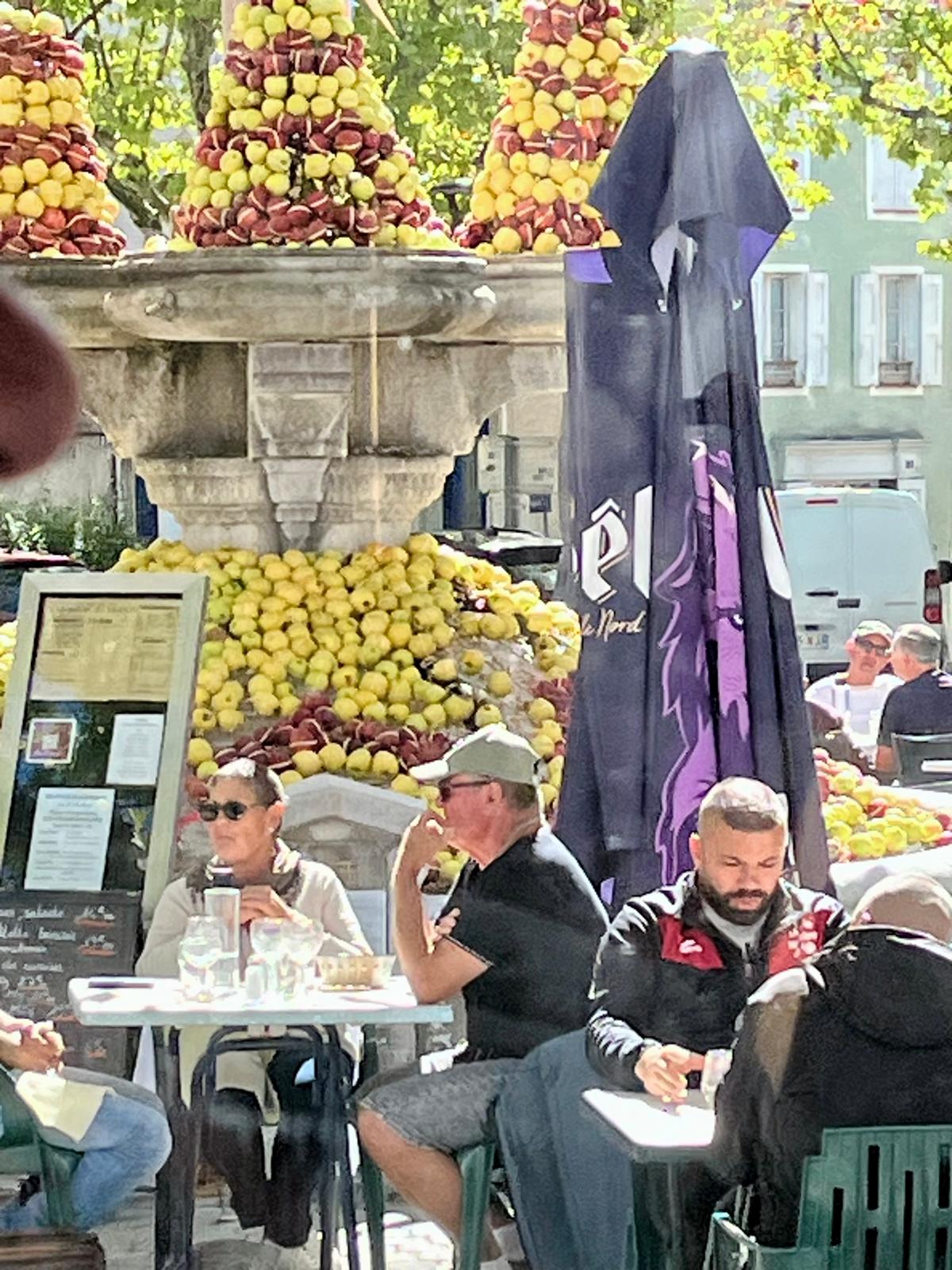 Het stadje is op loopafstand dus dat is makkelijk. Hier erg veel alternatieve winkeltjes. Wel vaak mooie toegepaste kunst bijvoorbeeld een backgammon spel in stof, ideaal om op reis mee te nemen. Veel kunstprojecten, theaters en cabaret optredens. Helaas is onze Franse woordenschat daar niet groot genoeg voor. Veel verval, mooie panden, maar achterstallig onderhoud. Dat Is eigenlijk wel wat we in heel Frankrijk veel zien. Mooie boekwinkels en ook een iemand die hele mooie lampen maakt. Leuk om doorheen te wandelen. In ouderwetse l’ epicerie ( kruidenierswinkel) spreek ik met de uitbater. Aardige vent, ik in mijn roestige Frans. Hij gaf aan dat hij uit Duitsland kwam, toen ging het babbeltje wel een stuk makkelijker.